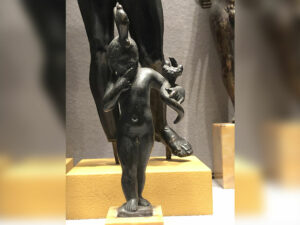 Harpocrate est un dieu enfant, c’est Horus chez les égyptiens, représenté nu, un doigt sur la bouche.