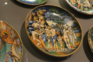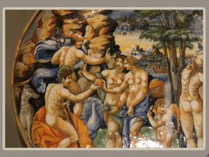 Salle 507 : (ancienne salle 19). Atelier Fontana. Aile Richelieu, 1er étage, Louvre. Galerie des Chasses de Maximilien. Le jugement de Pâris : coupe en faïence, Urbino, 1548. D’après une gravure de Marcantonio.